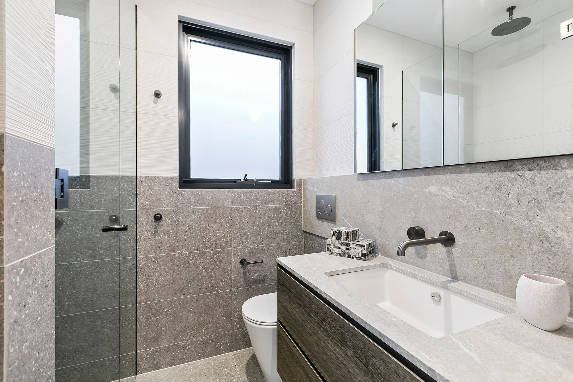 Terrazzo look tiles with contrasting feature mosaic finger tiles, Arcisan gunmetal grey progressive fixtures, European natural stone, Laminex Impressions joinery, frameless glass shower screens and integrated linear grates.